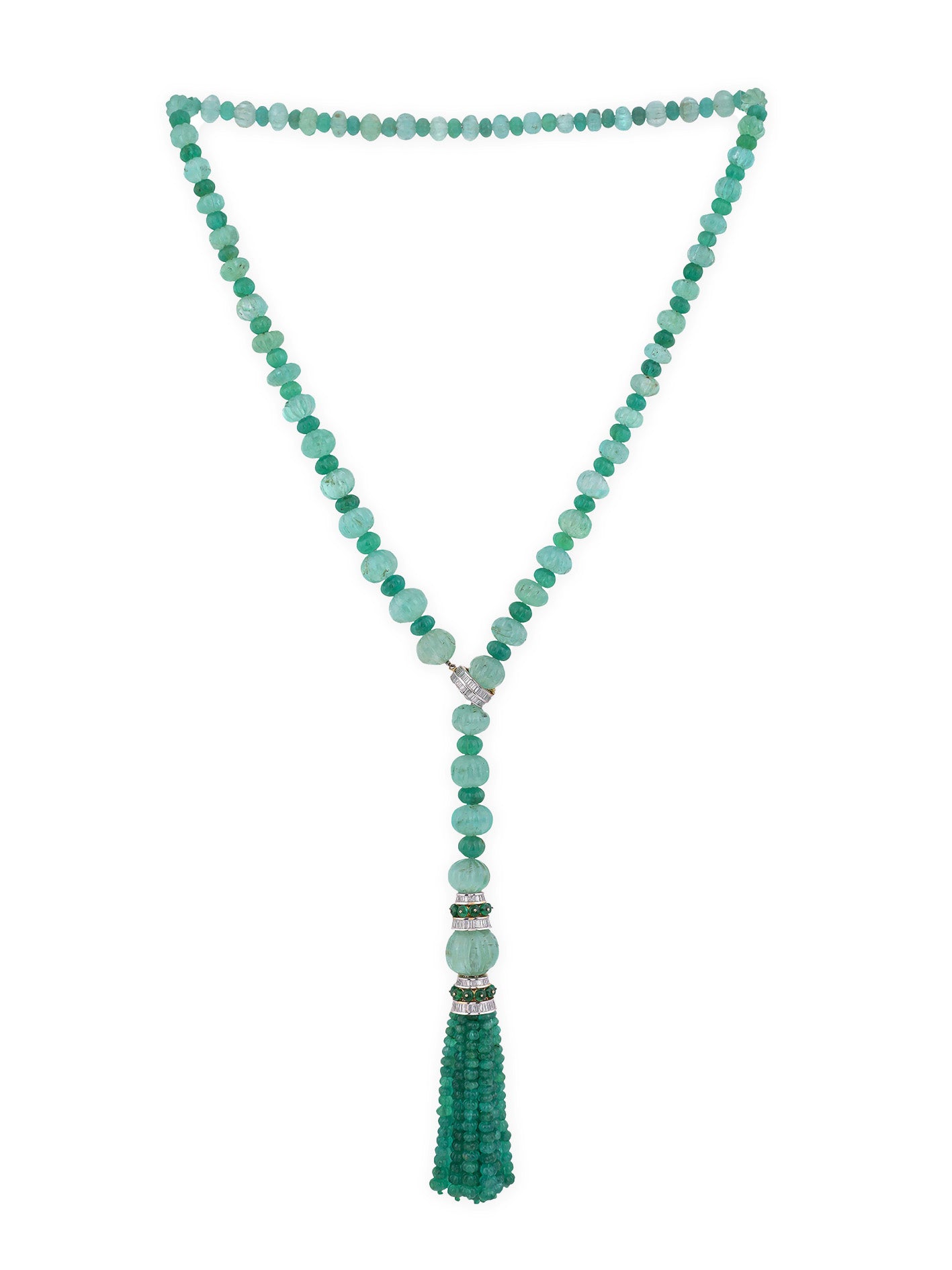 Gem Tie with 622.30 carats of Zambian, Colombian and Russian Emeralds featuring a secure clasp set with diamond baguettes.