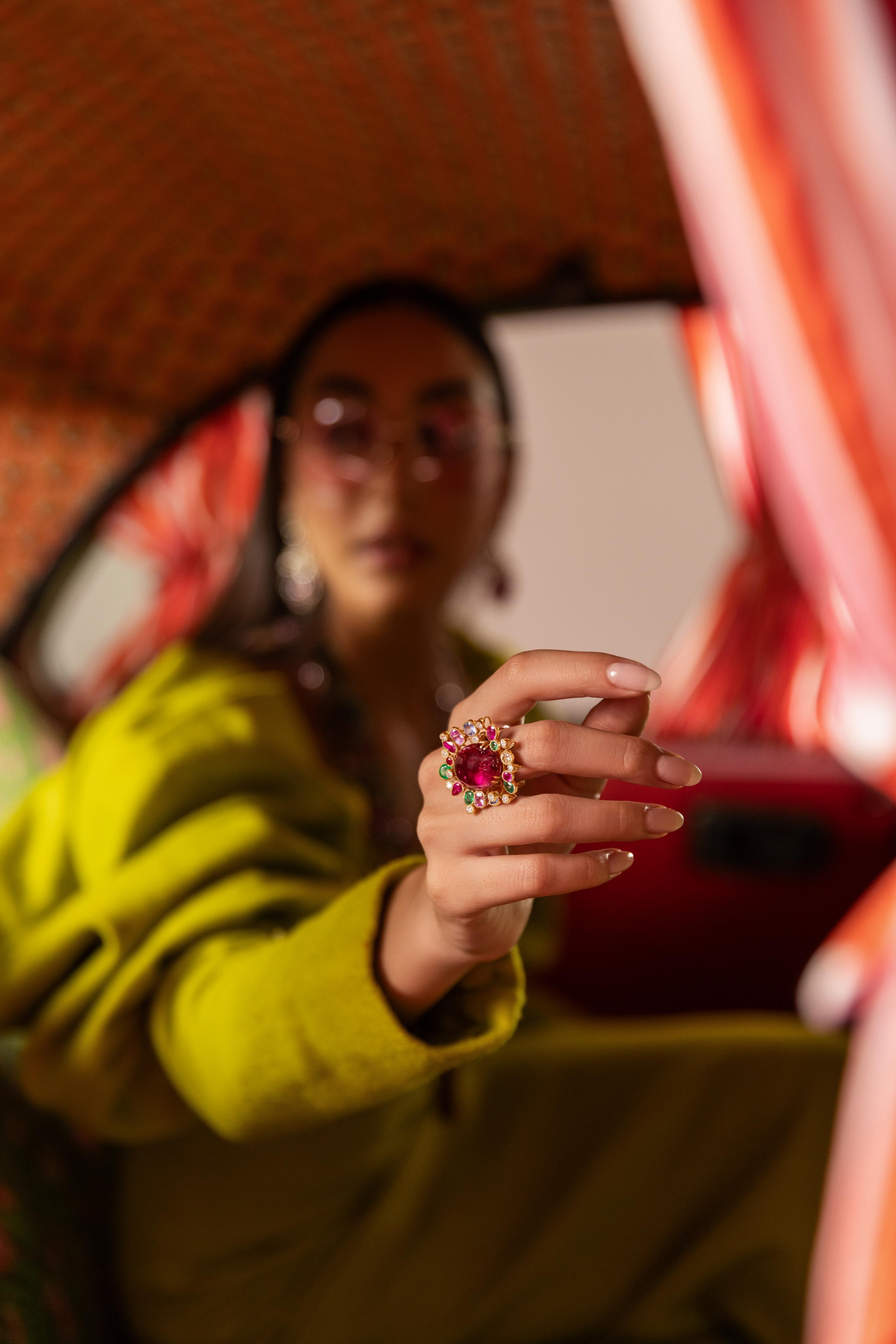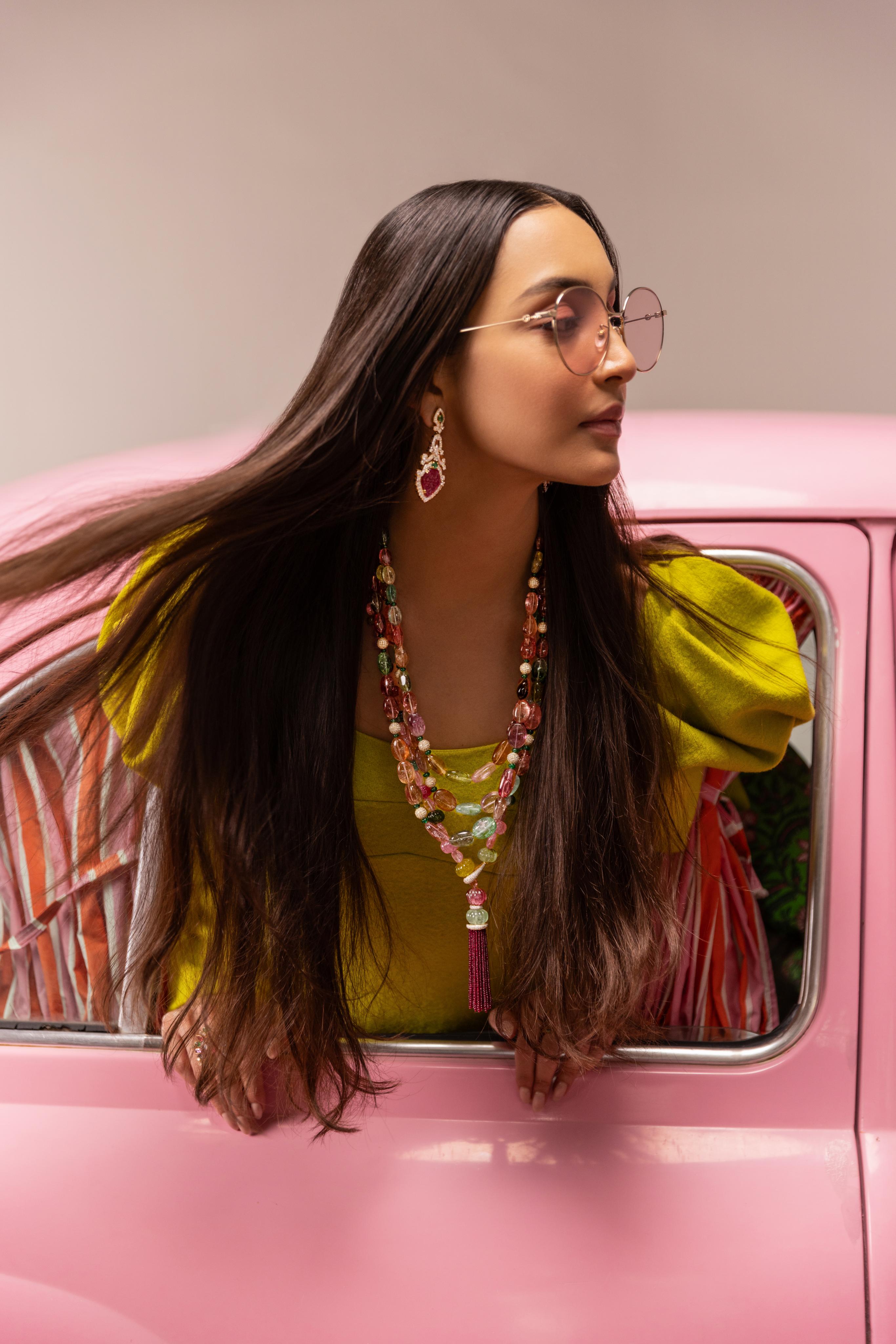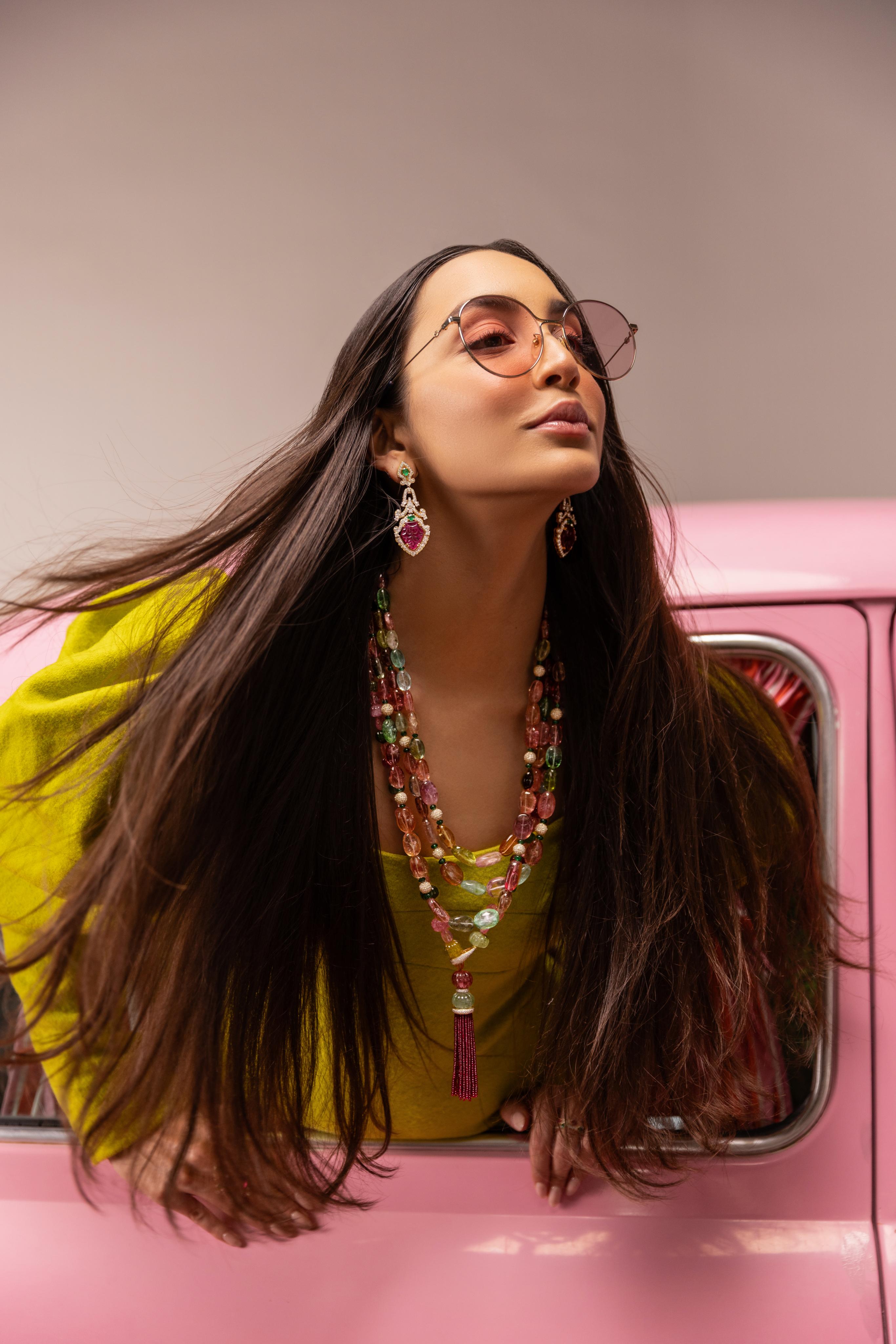 "Gem ties" drape the wearer in cascades of colourful gemstones, each strand meticulously strung and finished with a tassel.The innovation lies in the diamond-encrusted clasp, thoughtfully crafted to be secured anywhere along the string, offering unmatched versatility and an ever-evolving silhouette.