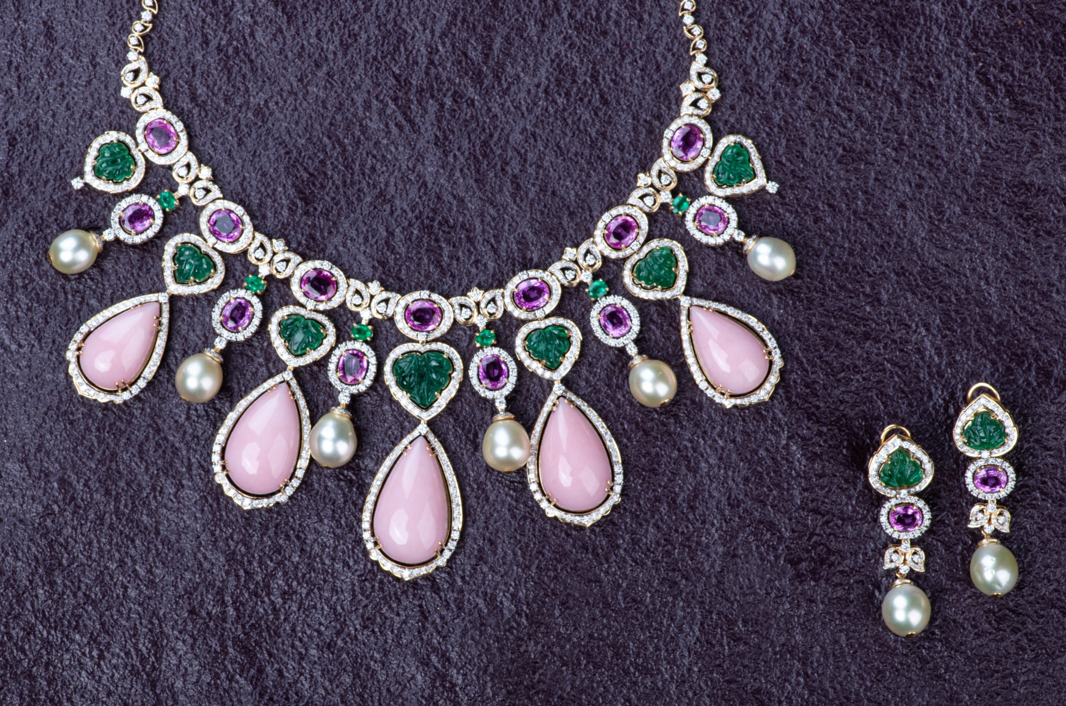 Necklace set featuring 142 carats of pink opal, carved Mughal emeralds, pink sapphires and south sea pearls.
