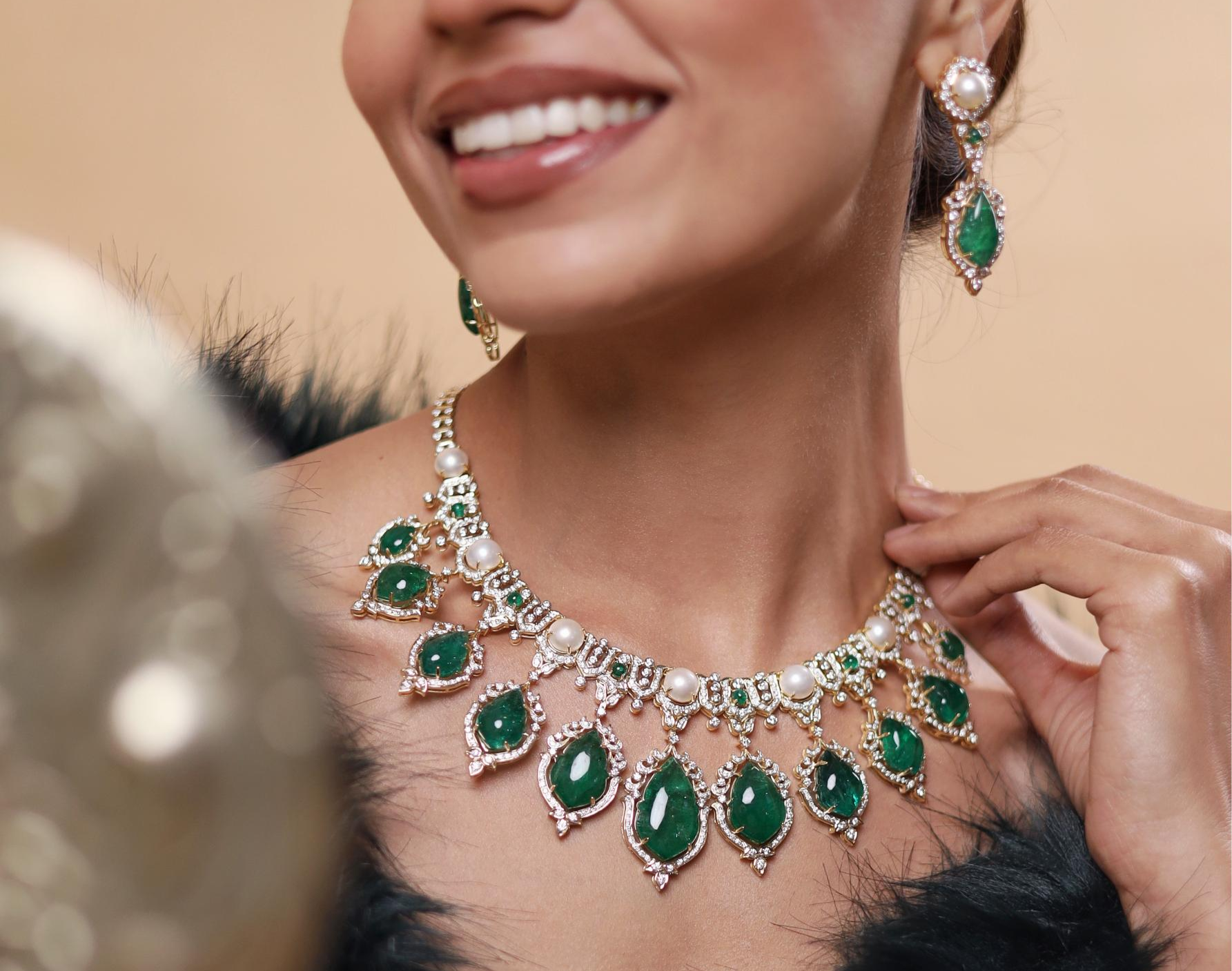 Nava celebrates new beginnings with deep green tulip-shaped emeralds, reflecting the vibrant patterns of the Spring Gate and the promise of renewal.