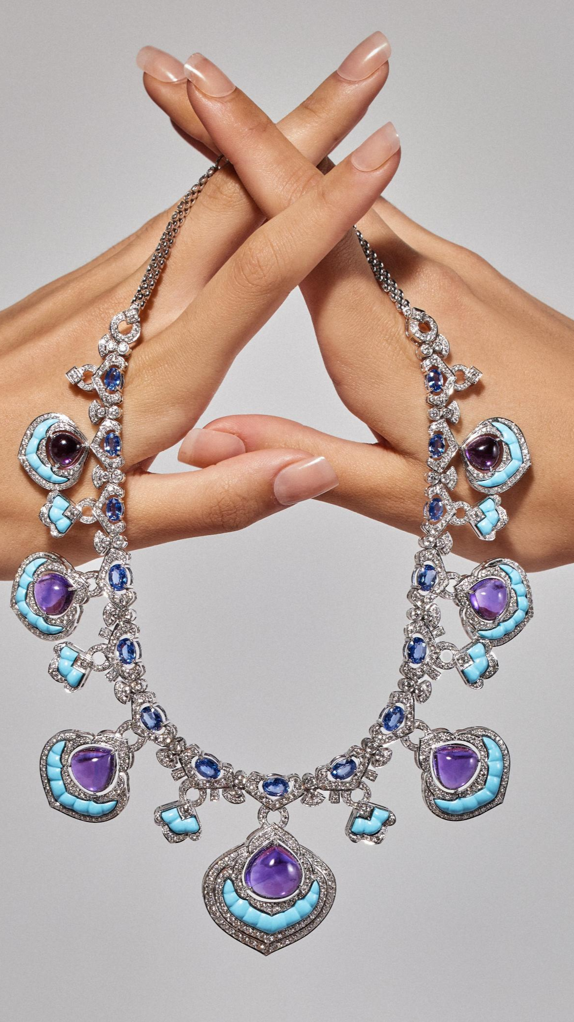 Necklace set featuring 50 carats of amethyst cabochons enhanced with custom cut turquoise and blue sapphires.
