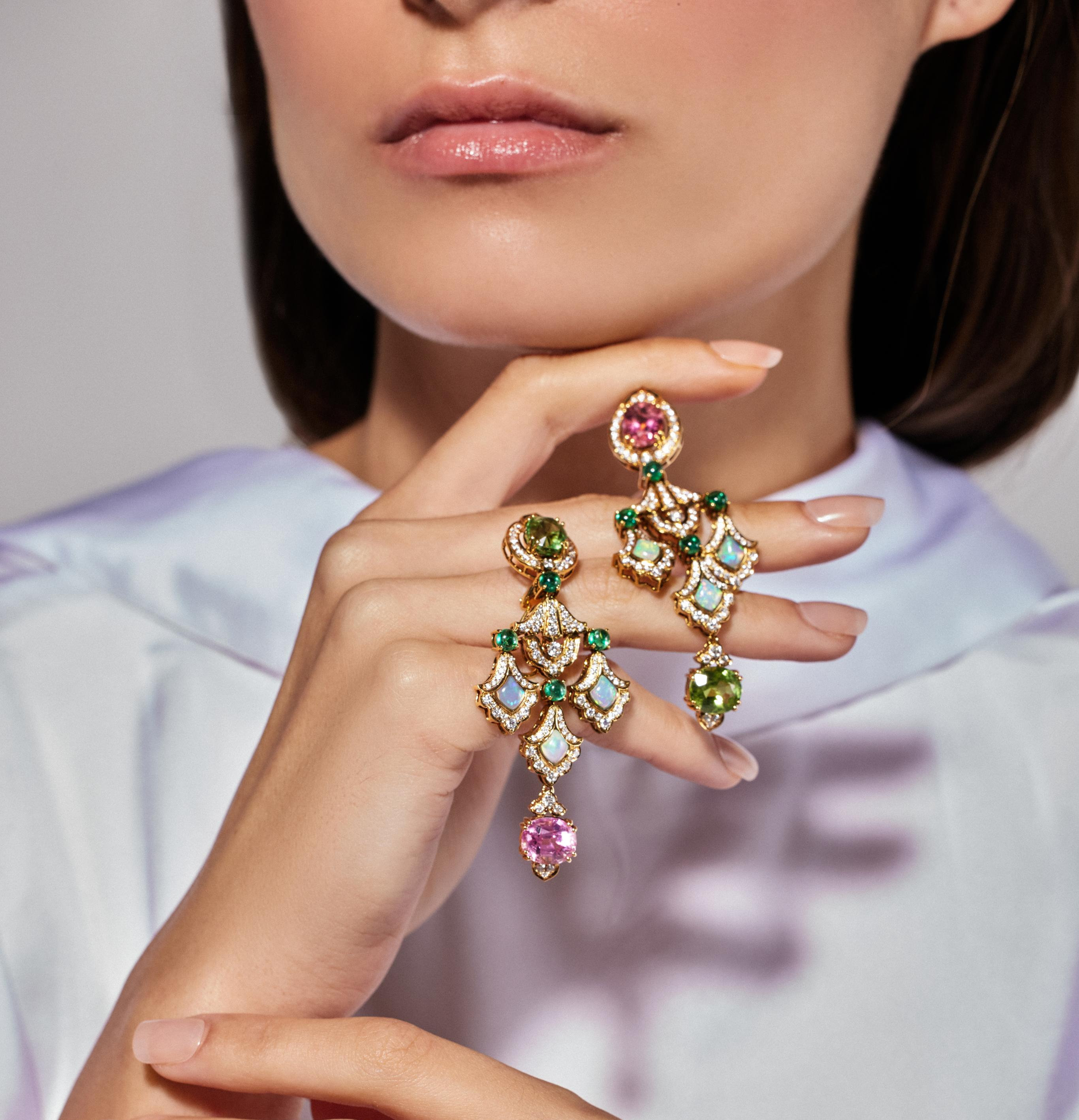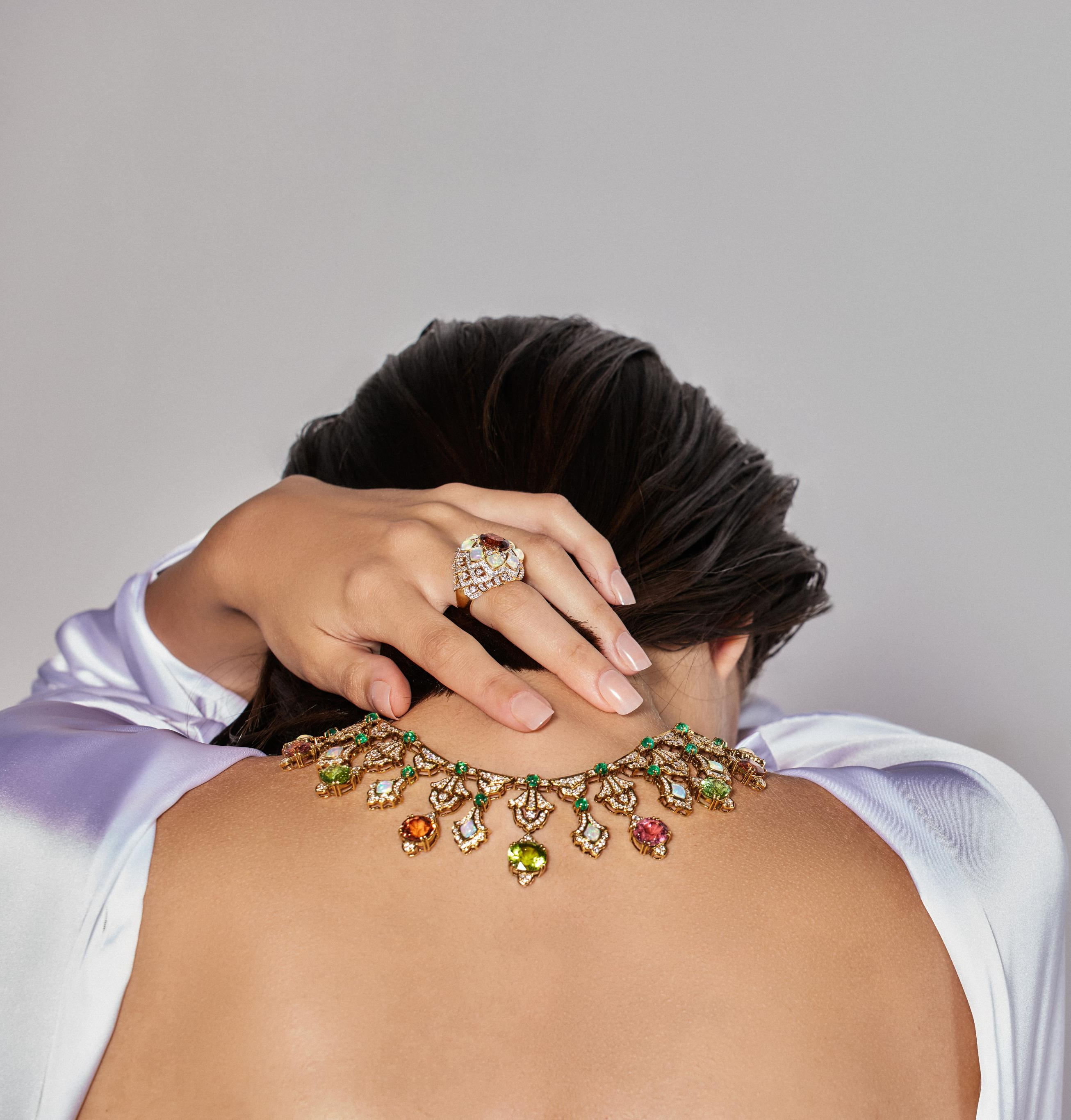 Inspired by the Lotus Gate, Padma reflects serenity and purity with petal-shaped Ethiopian fire opals and a palette of multicolored tourmalines reminiscent of a lotus in full bloom.