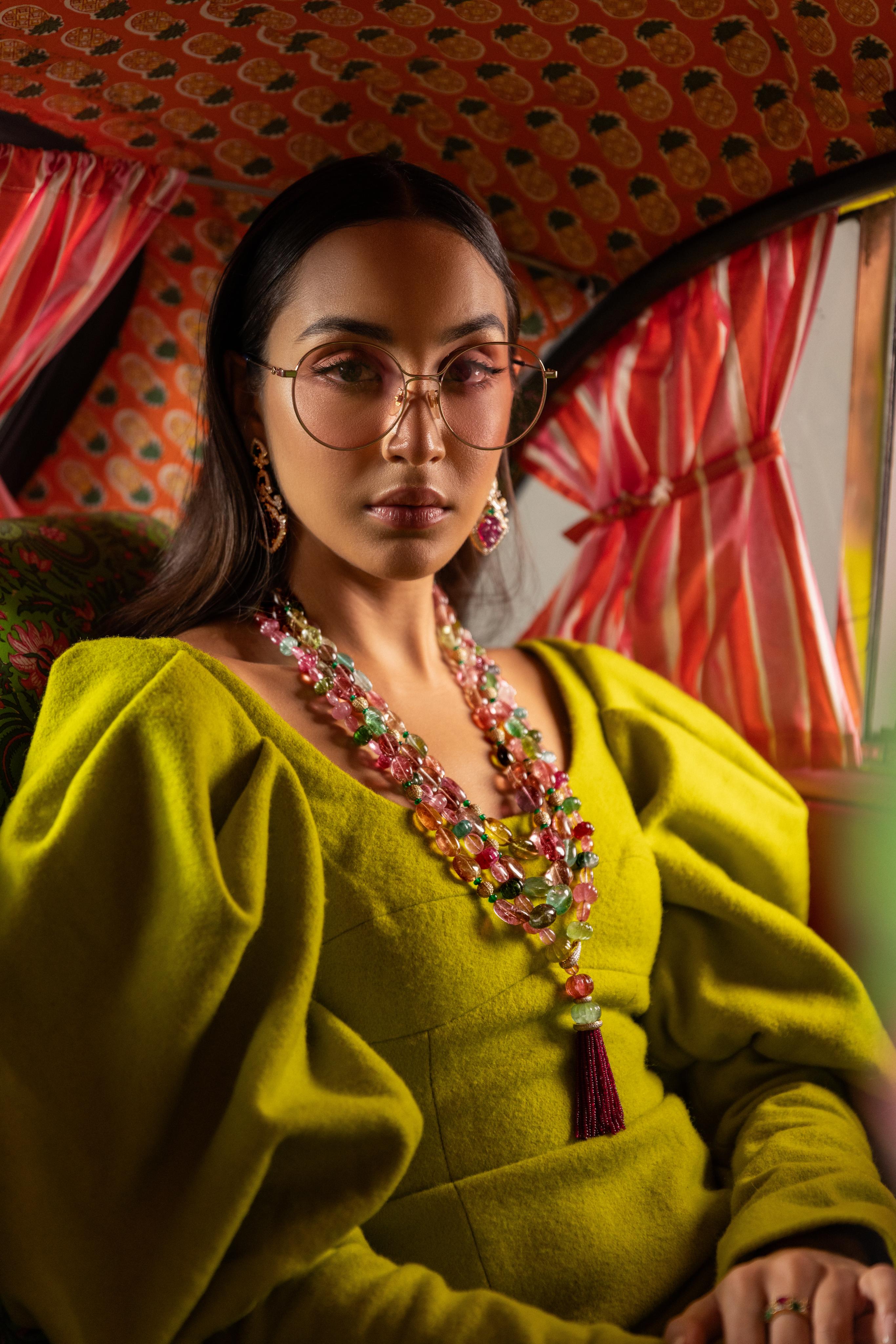 "Gem ties" drape the wearer in cascades of colourful gemstones, each strand meticulously strung and finished with a tassel.The innovation lies in the diamond-encrusted clasp, thoughtfully crafted to be secured anywhere along the string, offering unmatched versatility and an ever-evolving silhouette